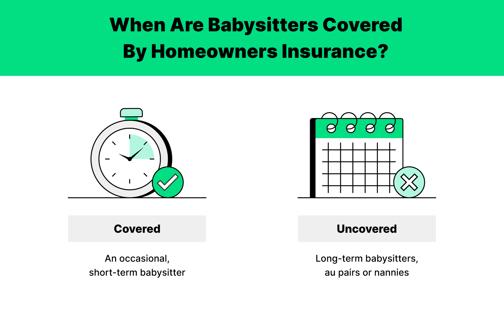 While some accidents will be covered by homeowners insurance, others won’t. A typical homeowners insurance policy will only cover your primary household members, and personal liability will cover injury to guests who decide to sue you. While infrequent babysitters who don’t work consistent hours may be considered guests, longer-term or consistent babysitters, nannies or au pairs are not considered guests and aren’t covered.