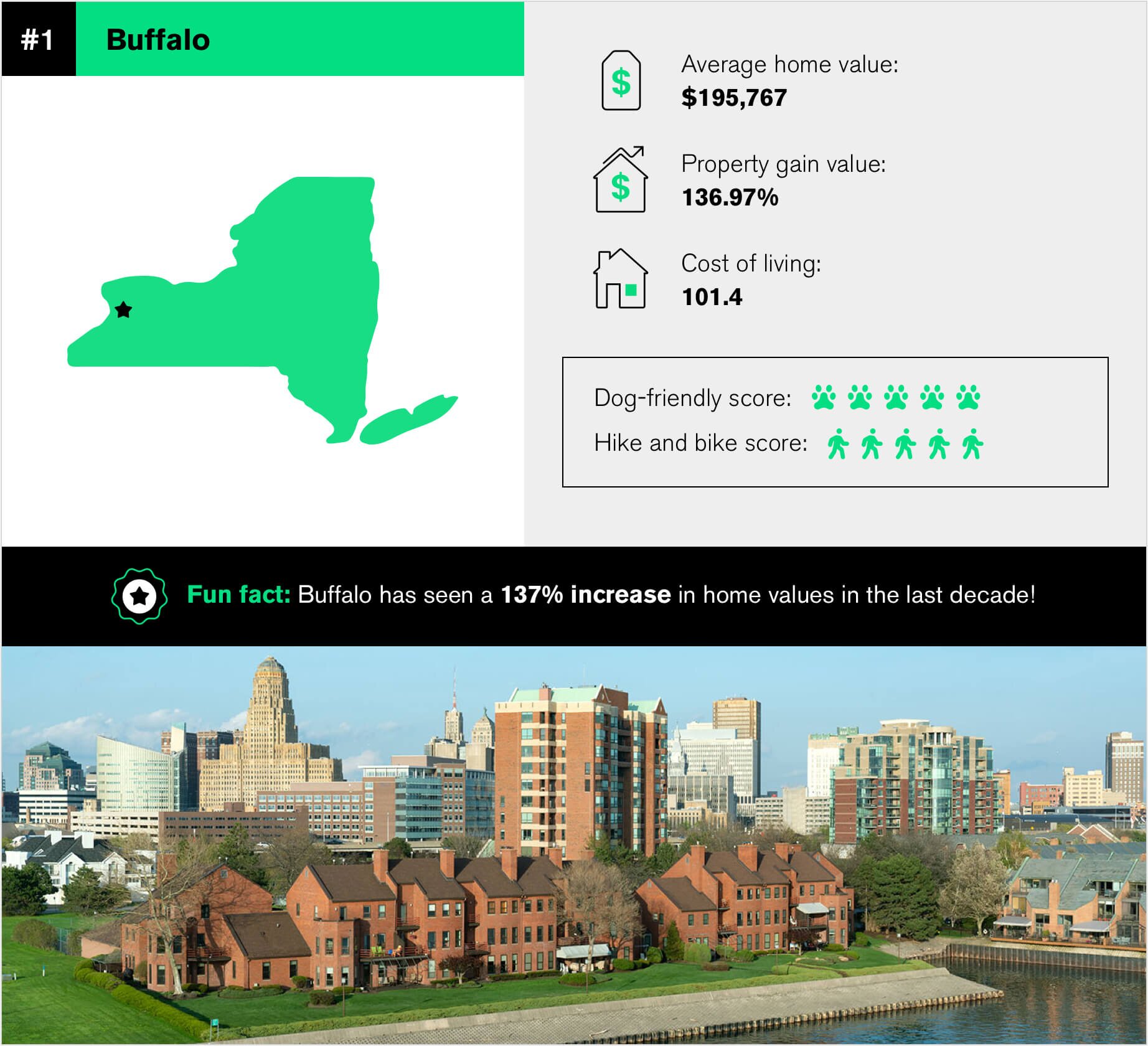 Average home value $195,767 Property value gain (over 10 years) 136.97% Percent of property crimes compared to the population 4.91% Comfort index (average of summer and winter scores) 6.4 Cost of living (national average is 100) 101.4 Walkability 68 Bike score 65 Number of dog parks 4 Pet-friendly businesses 16 Pet-friendly restaurants 75 Even though it’s the second-most populated city in New York, Buffalo’s main claim to fame is the fact that it’s the birthplace of the world-famous Buffalo wings. But outside of their chicken wing acclaim, there are a lot of little-known facts that make Buffalo the best place to buy a home in New York. Not only does Buffalo have an average home price of less than $200K, but it’s also seen property values soar an astronomical 137% over the past decade. In addition, it’s a pretty walkable and bike-friendly city, making getting around town a breeze — when the weather’s nice, that is.