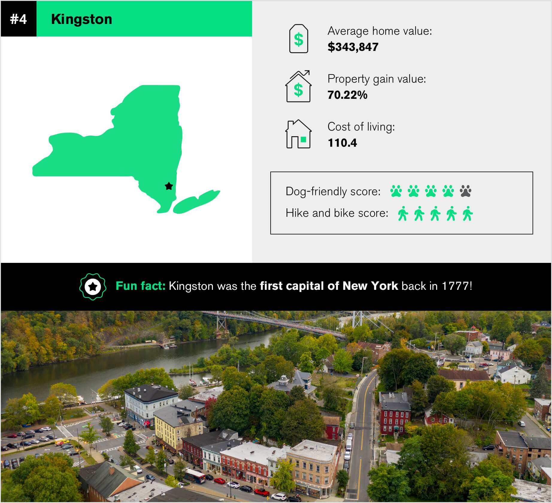 Average home value $343,847 Property value gain (over 10 years) 70.22% Percent of property crimes compared to the population 3.06% Comfort index (average of summer and winter scores) 6.9 Cost of living (national average is 100) 110.4 Walkability 57 Bike score 53 Number of dog parks 1 Pet-friendly businesses 3 Pet-friendly restaurants 15 At a stone’s throw away from New York City lies Kingston, a small town nestled on banks of the Hudson River. Known for its stunning landscape and storied past, Kingston was actually the first capital of New York back in 1777. With high property value gains and a downtown packed to the brim with shops, restaurants and entertainment, Kingston is a great spot for families and young professionals alike.