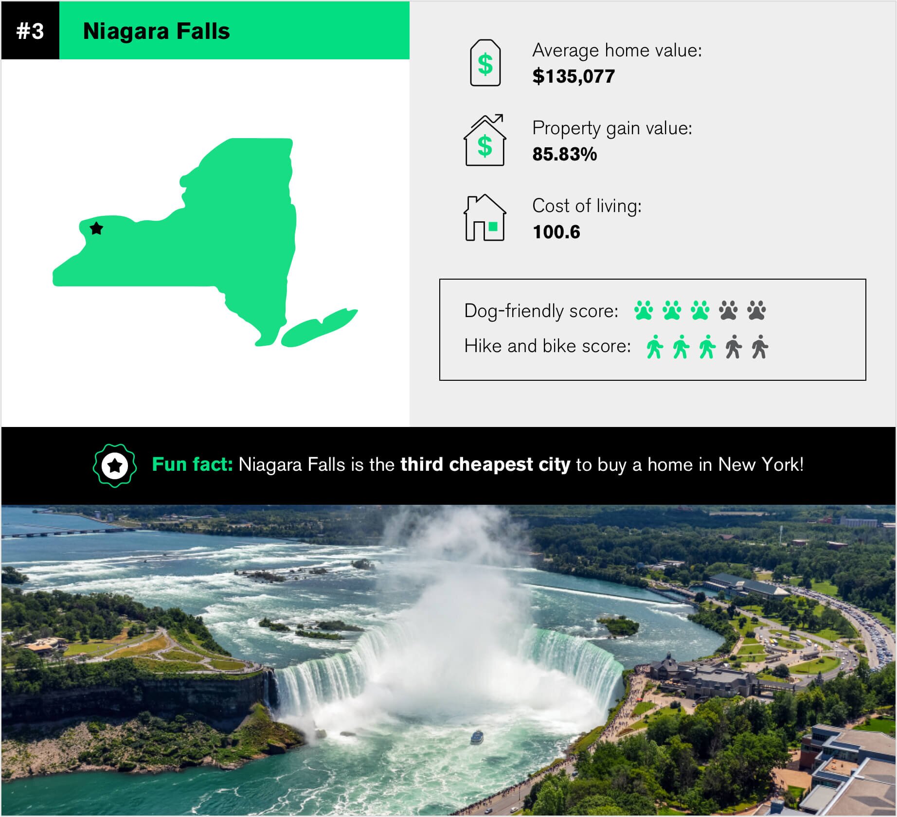 Average home value $135,077 Property value gain (over 10 years) 85.83% Percent of property crimes compared to the population 5.96% Comfort index (average of summer and winter scores) 6.45 Cost of living (national average is 100) 100.6 Walkability 49 Bike score 55 Number of dog parks 1 Pet-friendly businesses 4 Pet-friendly restaurants 12 A small town with plenty of charm, Niagara Falls is the third cheapest city to buy a home in New York (out of the 100 cities studied). But there are plenty of other reasons to move there outside of the home prices. With a relatively low cost of living, plenty of natural wonders to take in and a diverse population to boot, you’ll never be bored living in Niagara Falls. It’s worth noting, though, that Niagara Falls has the highest property crime rate of all cities studied, so if you do choose to settle down here, you’ll want to make sure your home insurance covers theft.