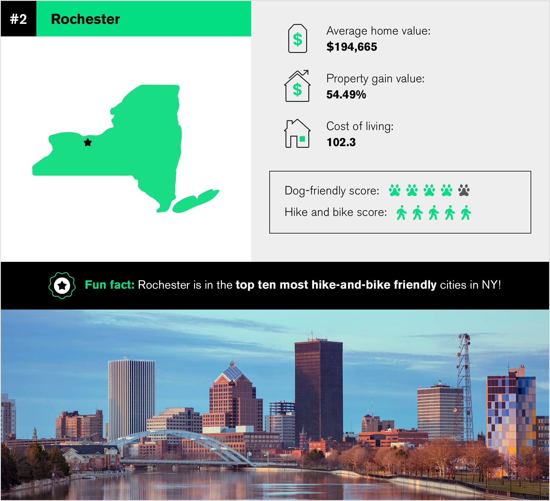 Average home value $194,665 Property value gain (over 10 years) 54.49% Percent of property crimes compared to the population 4.90% Comfort index (average of summer and winter scores) 6.6 Cost of living (national average is 100) 102.3 Walkability 65 Bike score 61 Number of dog parks 3 Pet-friendly businesses 21 Pet-friendly restaurants 66 The pandemic has changed a lot of our priorities. While some are packing up and moving to business-friendly cities to start their own venture, others may be moving to small towns with lower price tags. Luckily, Rochester offers the best of both worlds, as it was named the best place to live in the northeast post-pandemic by Business Insider and boasts an average home price of just under $200K. Need more convincing? Rochester is also home to over 65 pet-friendly restaurants, meaning you and your best friend can chow down on Rochester’s famous garbage plate any time you please.