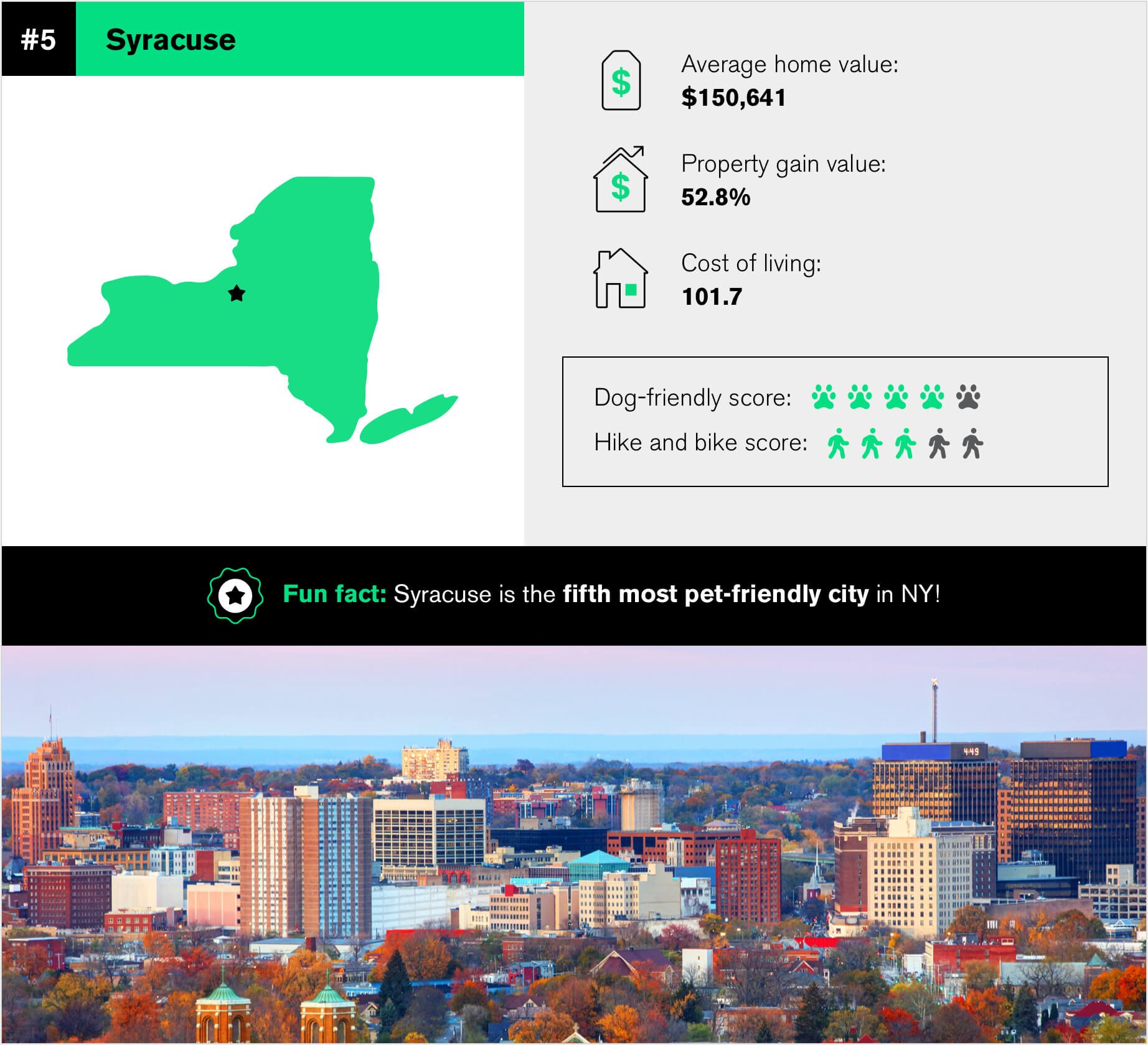 Average home value $150,641 Property value gain (over 10 years) 52.8% Percent of property crimes compared to the population 4.57% Comfort index (average of summer and winter scores) 6.35 Cost of living (national average is 100) 101.7 Walkability 60 Bike score 50 Number of dog parks 3 Pet-friendly businesses 9 Pet-friendly restaurants 33 Whether you love to tear down a mountain packed with fresh powder or want to spend your weekends perusing the oldest state fair in the United States, Syracuse is the place for you. With an average home cost of just over $150K (in sixth place for the most affordable home value out of all cities studied) and a property value increase of 53% over the past ten years, you can rest assured that you’ll love settling down in the fifth most populated city in the state. Another bonus? Syracuse is extremely pet-friendly, with dozens of businesses and restaurants opening their doors to your furry friends.
