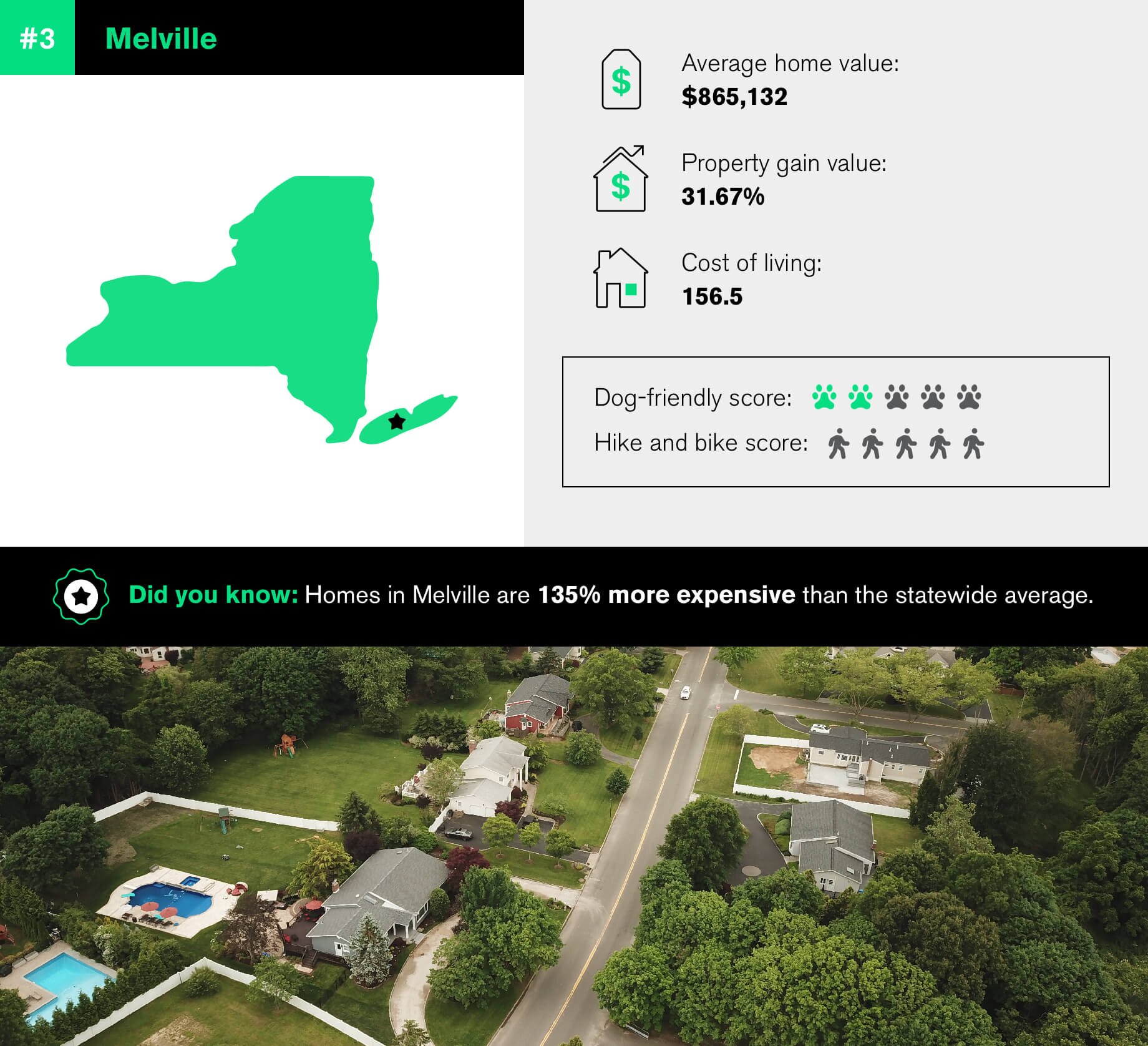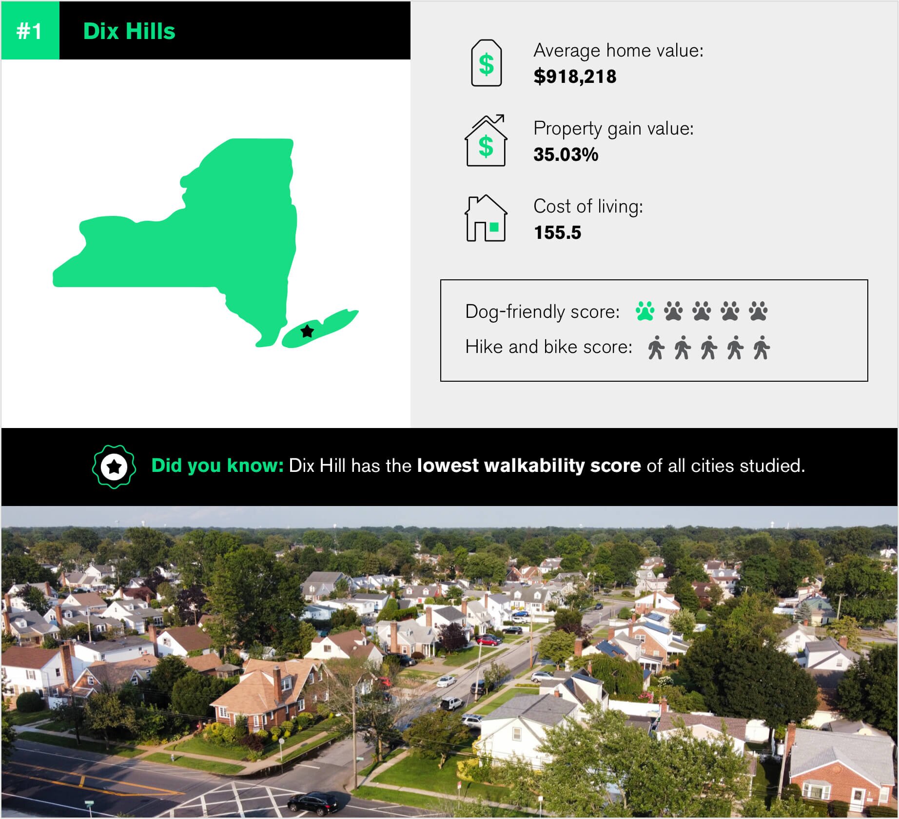 Average home value $918,218 Property value gain (over 10 years) 35.03% Percent of property crimes compared to the population N/A Comfort index (average of summer and winter scores) 7.15 Cost of living (national average is 100) 155.5 Walkability 12 Bike score 25 Number of dog parks 0 Pet-friendly businesses 0 Pet-friendly restaurants 1 Unless you have a cool $1 million lying around to pick up a home in Dix Hills, it’s best to cross this off your list of potential cities to call home. Dix Hills took the second spot for the highest home prices (Garden City, NY, was number one). It also has the lowest walkability score of all cities studied, meaning you’ll definitely need to buy a car to get around, which isn’t a huge deal but it’s something to consider. In addition, these homes haven’t grown in value much over the past decade, meaning it’ll be hard to get a good ROI when you do decide to sell.