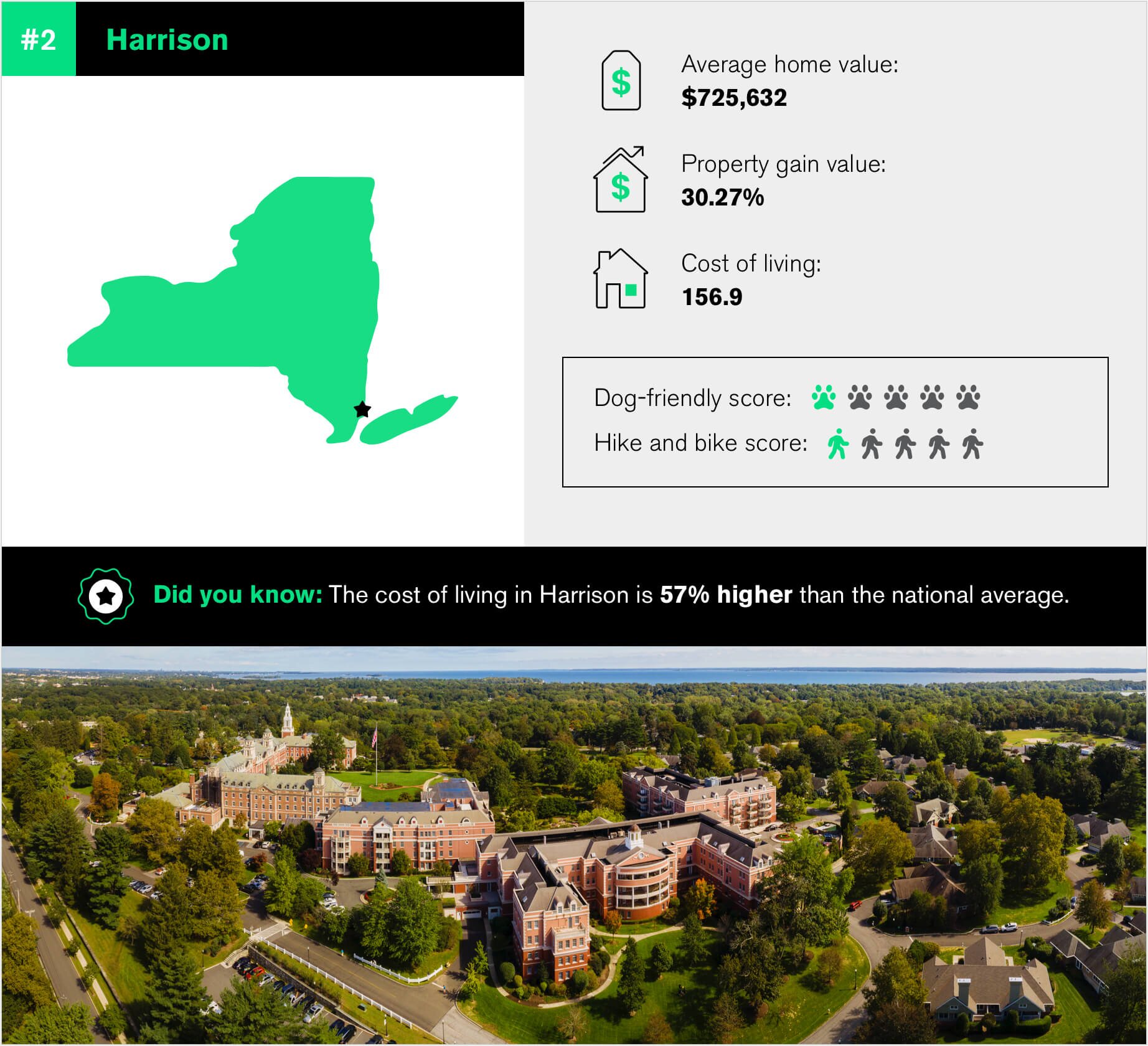 Average home value $725,632 Property value gain (over 10 years) 30.27% Percent of property crimes compared to the population 0.73% Comfort index (average of summer and winter scores) 7 Cost of living (national average is 100) 156.9 Walkability 37 Bike score 31 Number of dog parks 1 Pet-friendly businesses 0 Pet-friendly restaurants 2 Coming in at number two in our cities to skip is Harrison, due to its high home prices, cost of living and minimal ROI on most homes. Though the city has plenty to do, such as visiting The Neuberger Museum of Art, you’ll be spending a lot more on necessities in a city like this than you would in Buffalo or Rochester, for example. Plus, it’s not super pet-friendly, which can be a bummer when you’re looking to take your pup to the park after work. However, the area is known for its school system, so the high price may be worth it if you’ve got young kids in the family.
