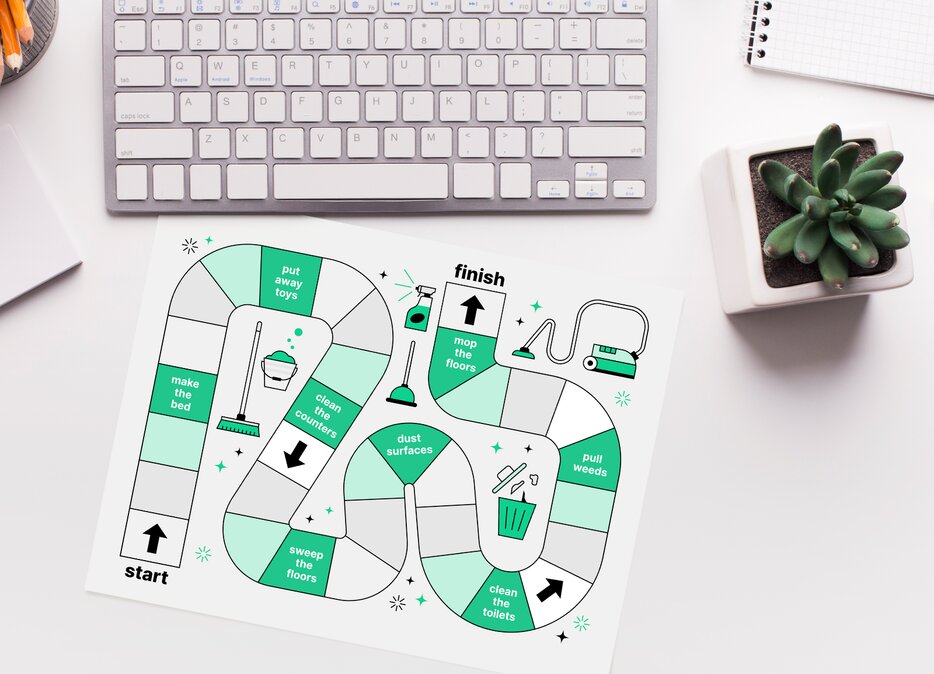 Let fate decide your child’s chores with a game board that assigns the tasks for you. All you need is a six-sided die and some game pieces. Then, set up your children on the “go” square and have them roll. Each child continues rolling and completing tasks until they reach the end of the game board. Game pieces can be paper clips, bottle caps, coins or any other small trinket.