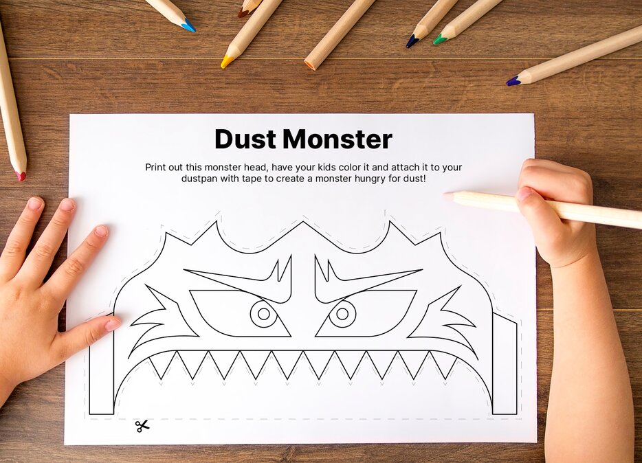 Turn your dustpan into a monster who is hungry for dirt and dust. Attach a printable monster mouth to the dustpan, so it appears to be “eating” the debris as your kids sweep it up. A little creativity goes a long way.