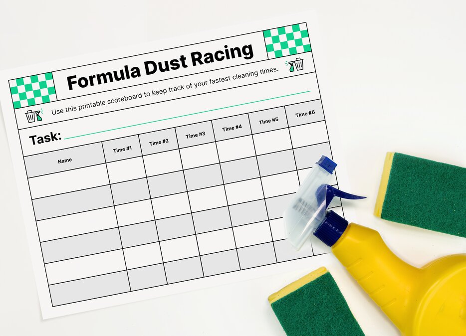 Create your own Cleaning Formula One by creating timed trials of various tasks and challenging your children to beat themselves or each other. See who can sweep the bathroom, clean the counter or scrub the toilet the fastest. For added ambiance, play sound effects of cars revving and people cheering and keep score on a printable scoreboard.
