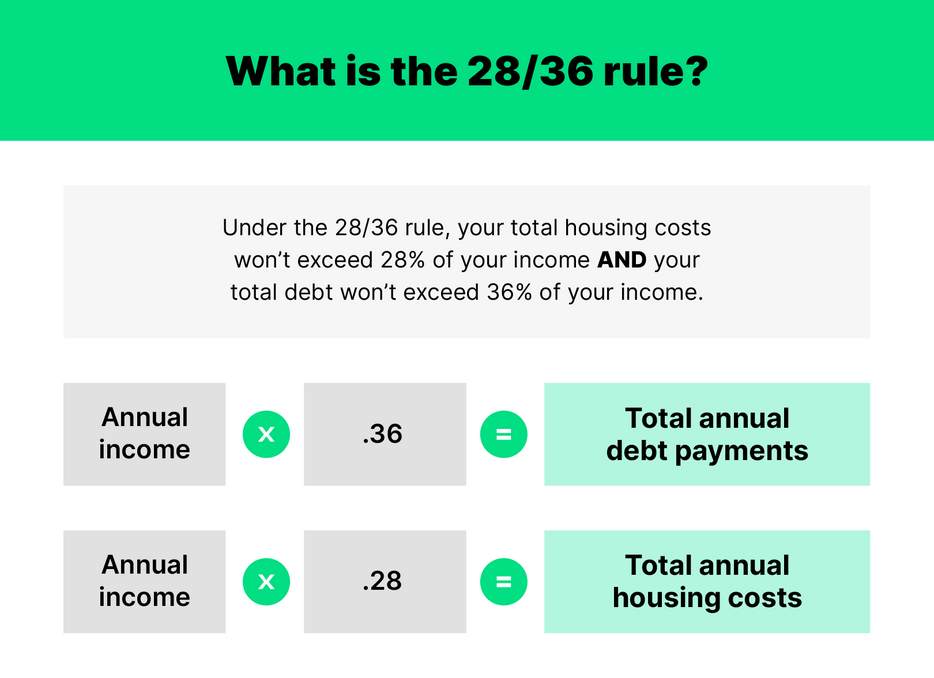 When calculating how much home to look for, people often refer to the 28/36 rule. With this rule, your housing expenses shouldn’t exceed 28% of your annual income and your total debt shouldn’t exceed 36% of your annual income.