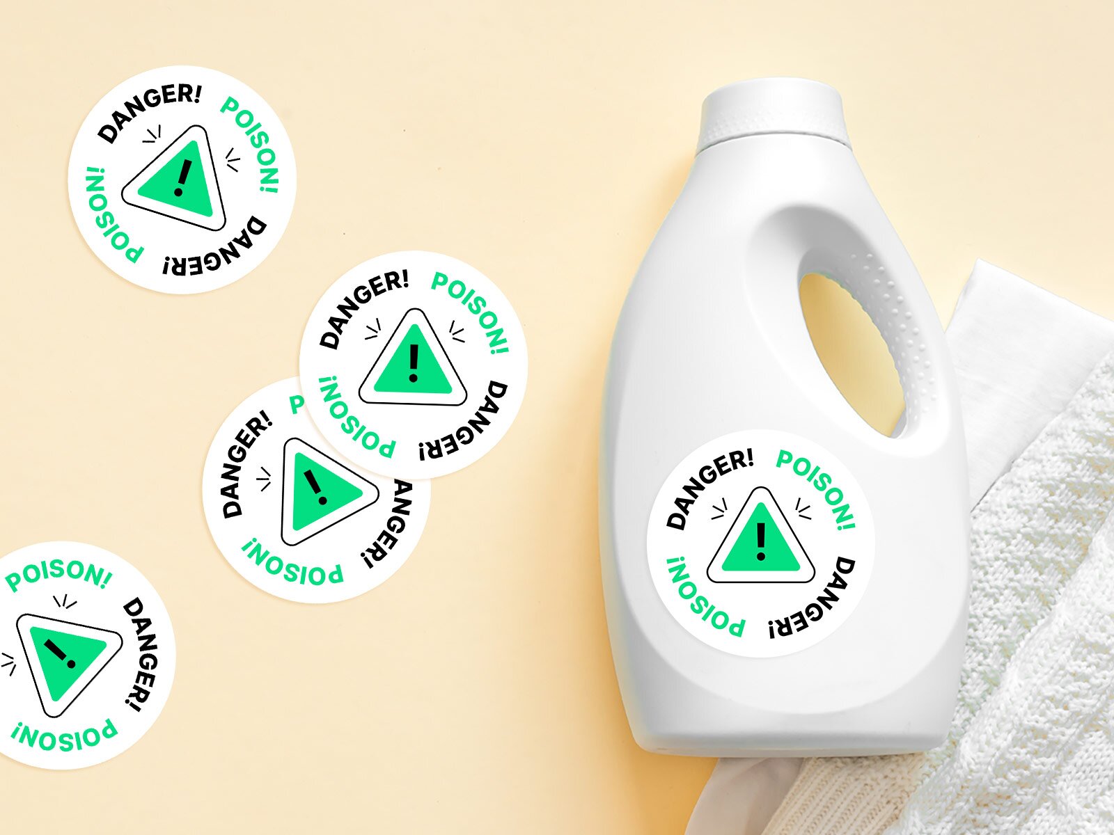 Labeling bleach and detergent bottles in the laundry room can also teach small kids not to touch or ingest them. Using printable stickers like the ones we’ve provided below can help kids remember that detergents and bleaches are potentially dangerous and should be handled with care. But when possible, these items should be placed on high shelves out of reach.