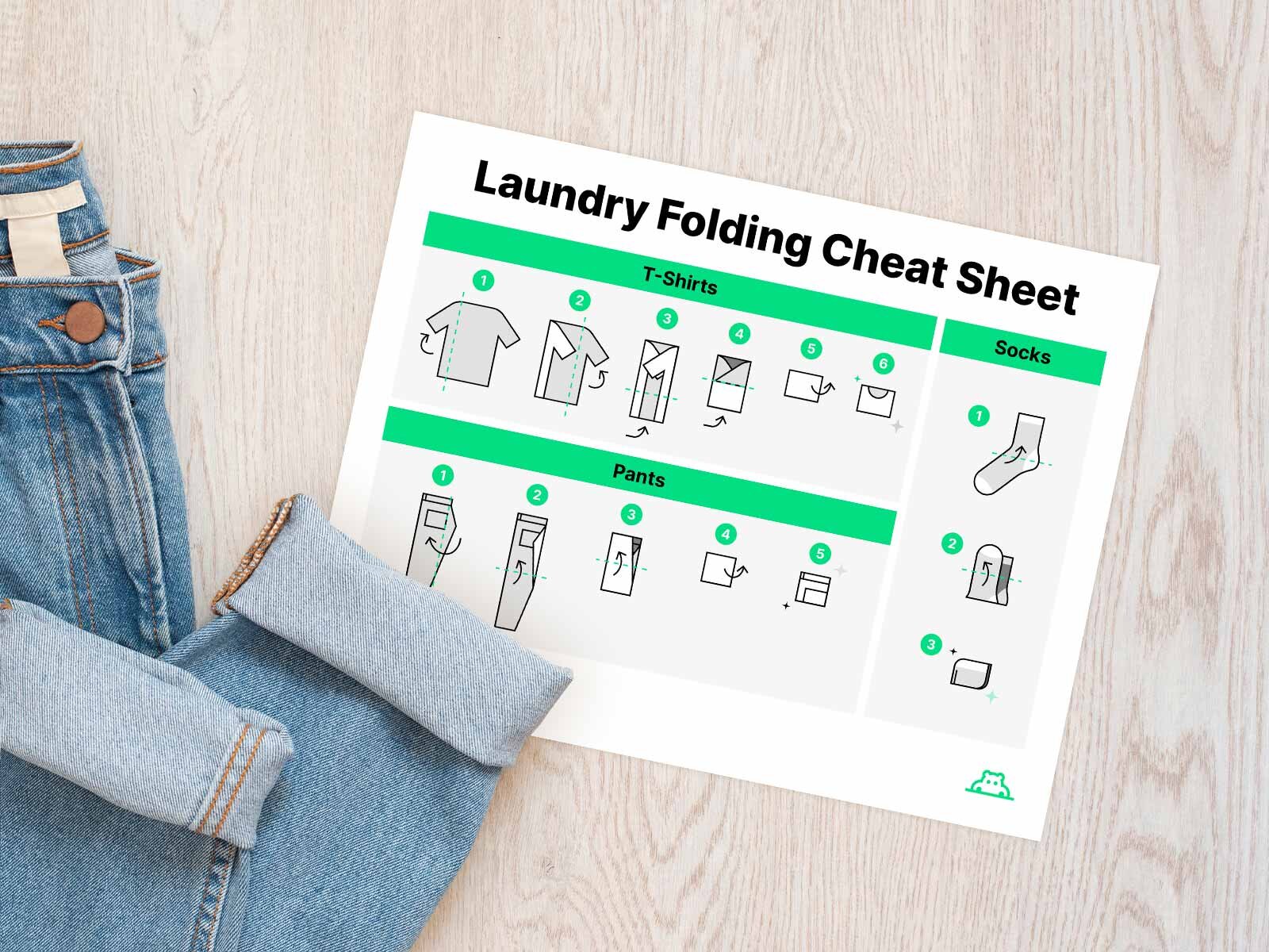 The first step is to teach kids that folding laundry straight out of the dryer cuts down on wrinkles, so it’s best to do it as soon as possible. The easiest way to teach kids to fold clothes is to do it with them until they get the hang of it. You can also print out cheat sheets like the ones below to show kids how to get started.