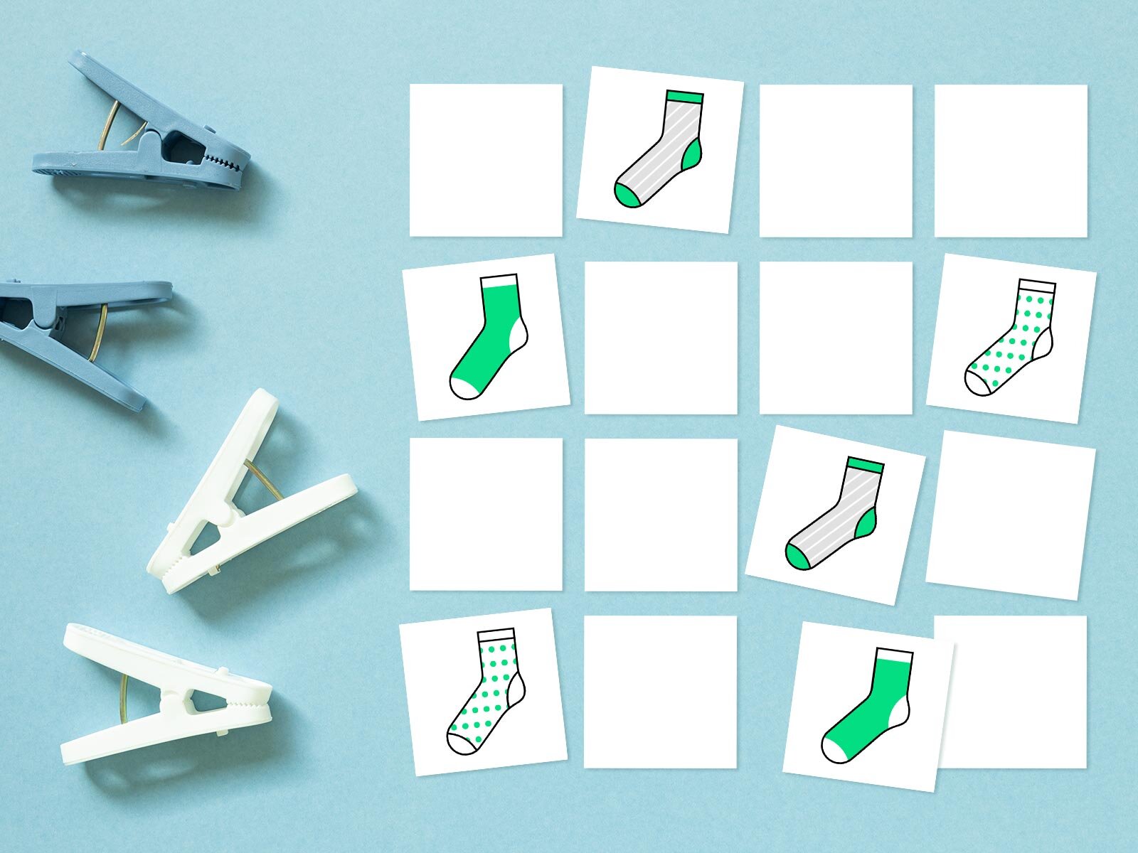 Matching socks can be tedious — but no one wants a mismatched pair! Use this printable game to teach kids to match socks in a fun way. Print out the sheet of socks, cut each one out and put them face down on a table. Have your kid turn over two tiles. If they match, leave them turned over. But if they don’t, put them back face down! Keep repeating until all the socks are in their matching pairs.