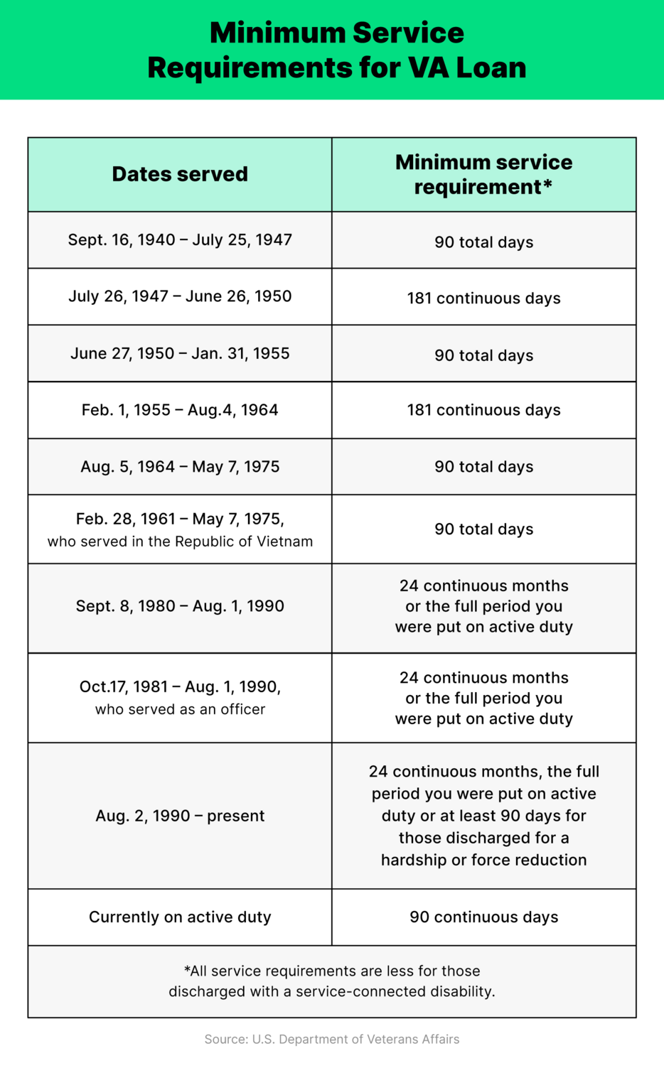 Service requirements vary based on time and dates served but are broken down by the U.S. Department of Veterans Affairs like this: