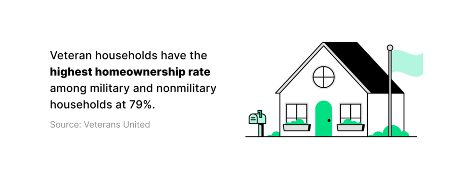 - Veteran households have the highest homeownership rate among military and nonmilitary households at 79%.