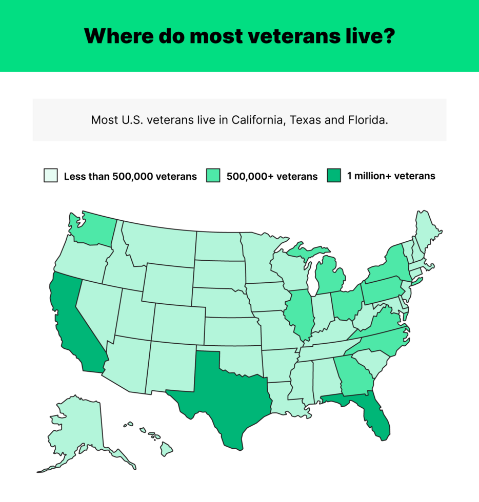 Most veterans in the United States live in Texas, Florida, and California. About 1.4 million veterans lived in Texas in 2022.