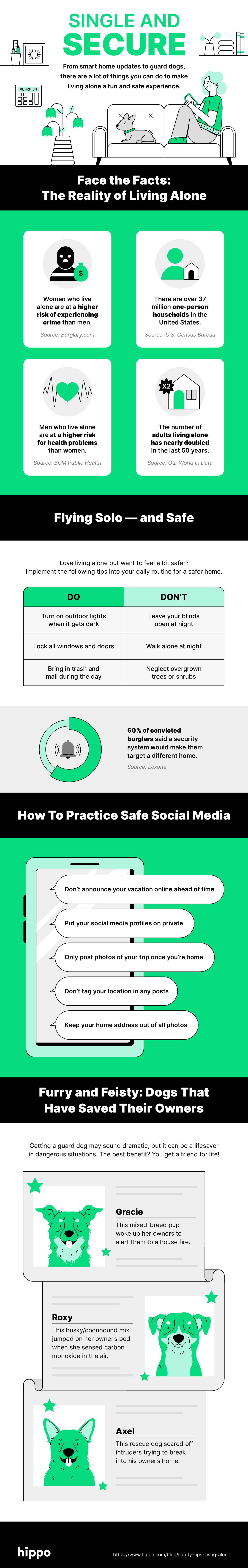 Smart homes are all the rage these days, both for their convenience and added security. Those flying solo in their homes should definitely consider upgrades like indoor and outdoor cameras, video doorbells, smart thermostats and water leak detectors. Consider them an extra set of eyes, ears and hands that you can always count on to keep you safe.