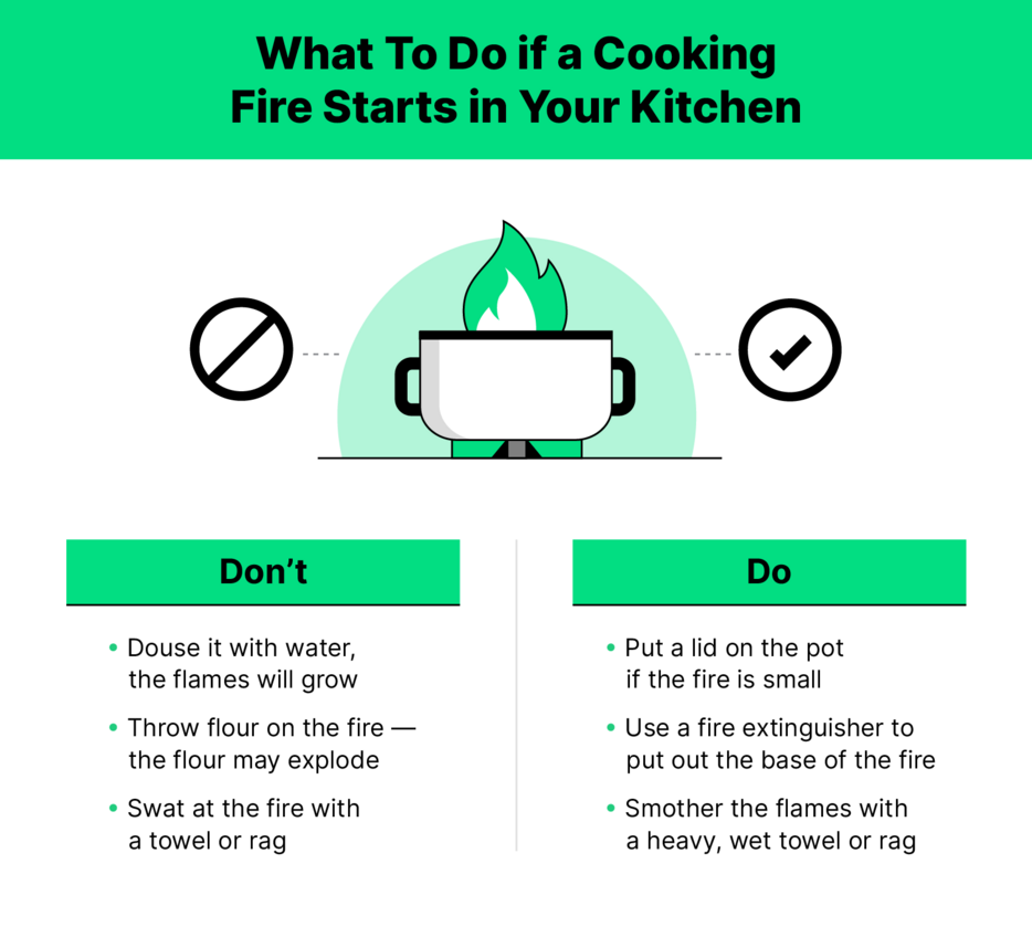 In the event a fire does start in the kitchen, keeping a cookie sheet or pot lid nearby to smother the flames as soon as you spot them can help keep a small fire small. Smothered flames usually burn themselves out if the fire is contained to one pot.